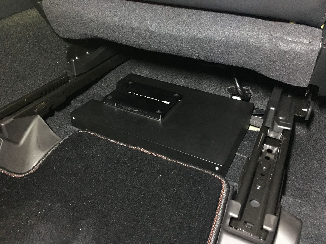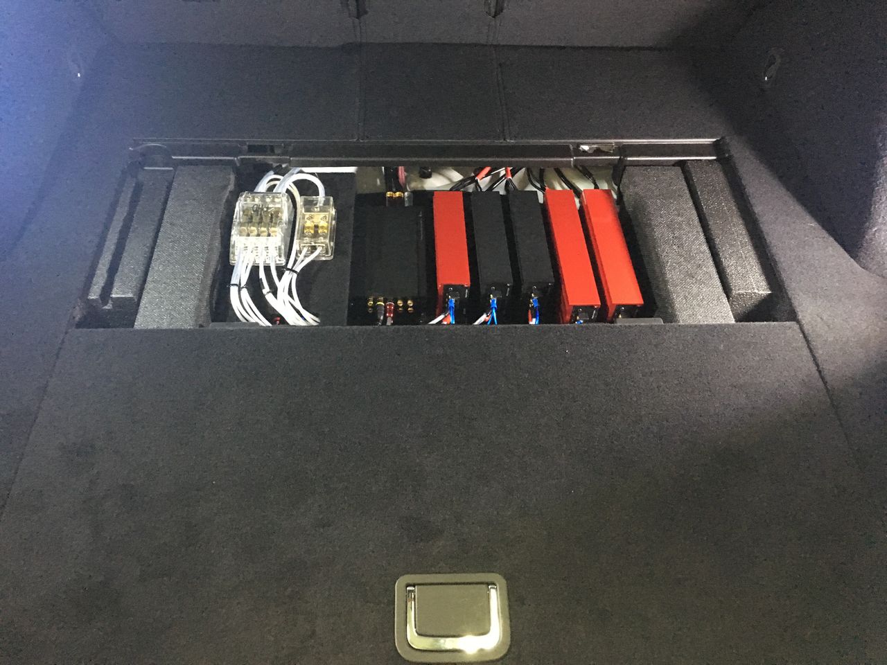 トランク床下にBEWITHのプロセッサーステートA6とD52R用のP-1Rとツイーター用のP-100、サブウーハー用のP-100Rを設置させて頂きました。
