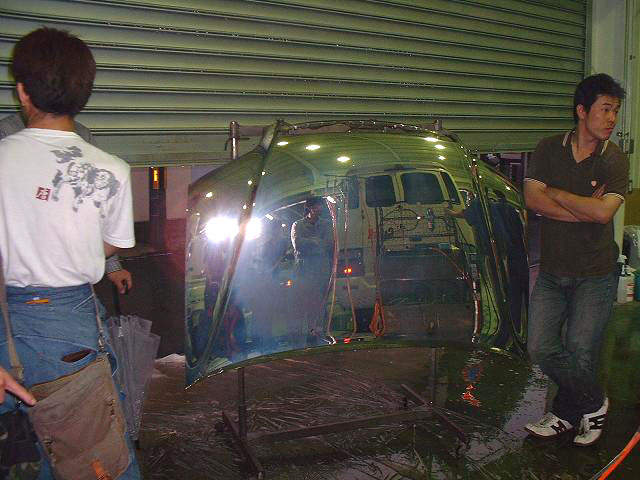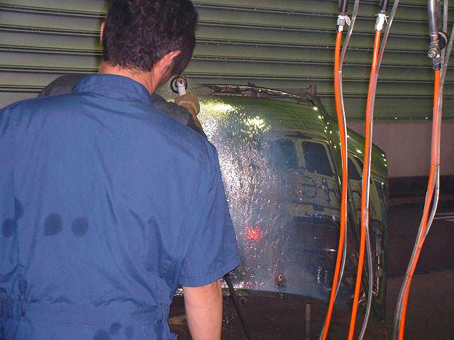 何種類かの液体をかけながら洗浄していましたが、最後に水をかけると一瞬にして白いボンネットがメッキに変わりました。